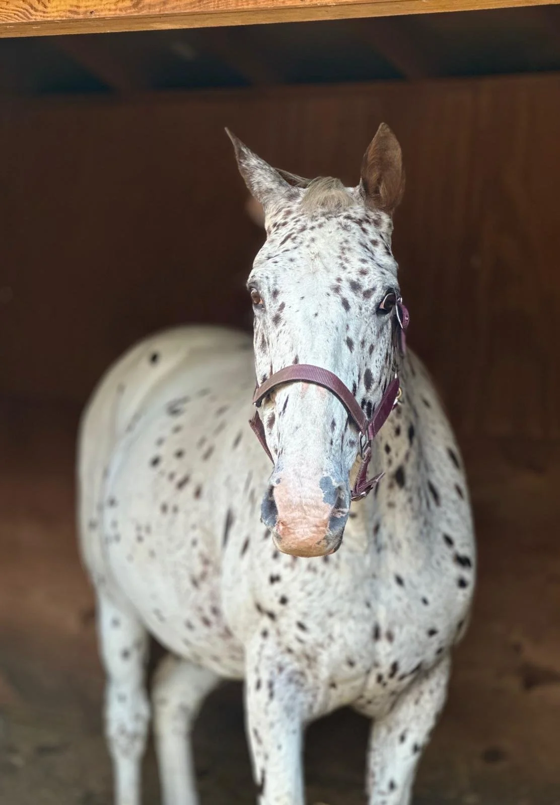 Pebbles is an Appaloosa mare in her 30s who is lively and talkative! She is visually impaired, but that does not stop her from knowing when food is on the way! Pebbles starts talking to our feeders when they drive up to the paddock. While Pebbles is not easy for the farrier, oral sedation helps farrier visits go smoothly. Pebbles loves people and would be a great addition to your home as a companion.