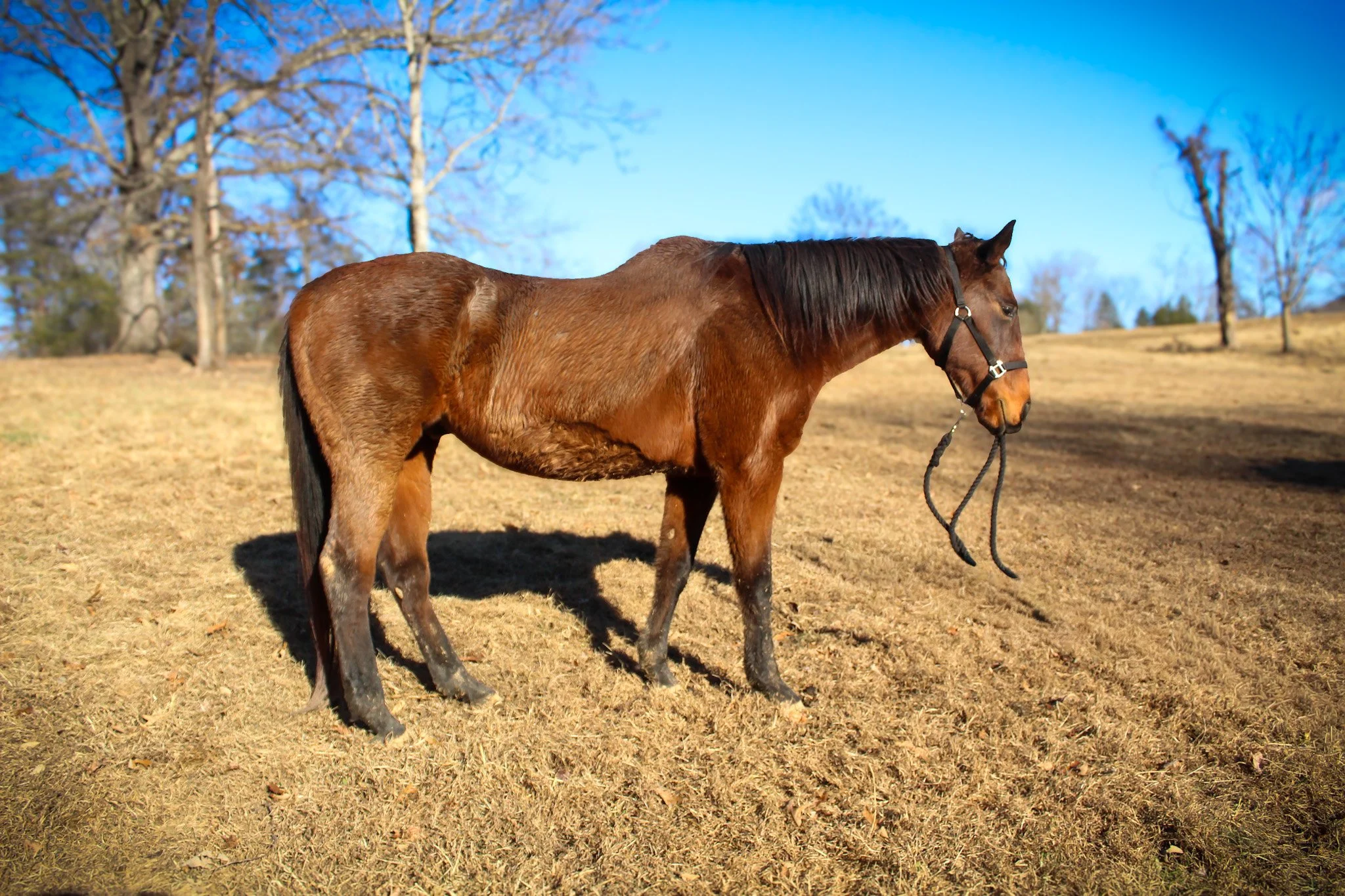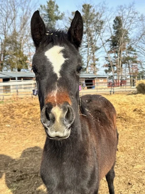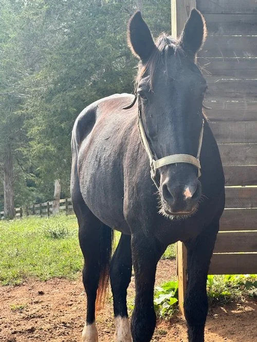 Champagne is a Morgan mare in her 20s. She is very sweet and loves attention. Champagne came to us overweight and her feet indicate issues with founder. She is currently pasture sound and can be managed with diet and exercise. Champagne’s previous home said she was never formally trained to ride, so we are adopting her out as a loving companion. If you want a buddy to greet you at the fence, she’s your girl!