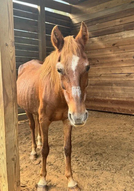 Porter is a thoroughbred in his 20’s who came to us through a law enforcement seizure this summer. He has been on a re-feeding program since his intake and has made great improvements and his personality has really been shining through! Porter is lovely to handle, good for the vet and farrier, and is just happy to be around people. Porter does have dental issues and needs to be on chaff and grass. Porter is available as a non-rideable companion only.