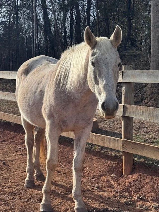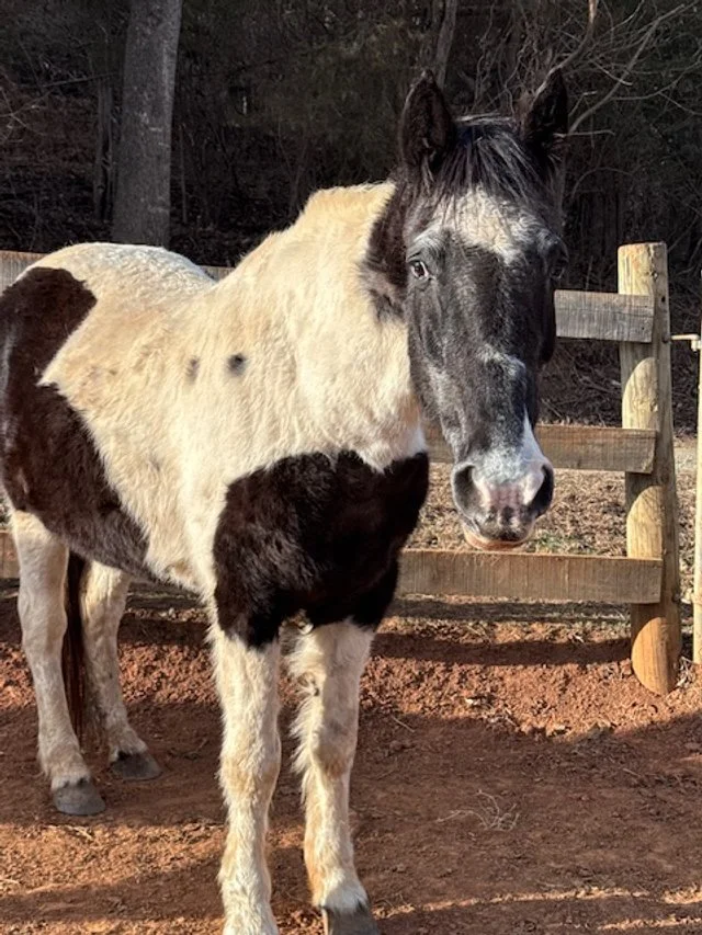 Fina is a 30ish year old mare who came to us recently when her owner was no longer able to care for her. She will be available once she gains a bit more weight.